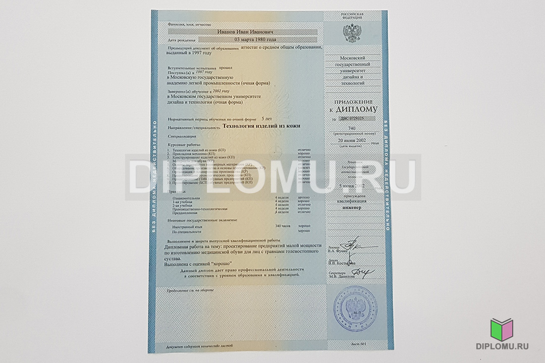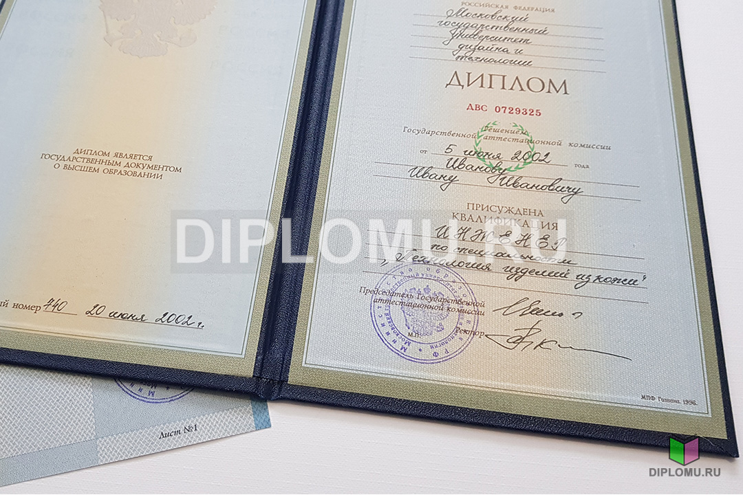На нашем сайте Вы можете купить диплом о высшем образовании с окончанием ВУЗа в 1997, 1998, 1999, 2000, 2001, 2002, 2003 годах. В данном разделе представлены образцы и фото диплома, ознакомиться подробнее с которыми можно, кликнув по картинкам ниже. Наши специалисты заполнят диплом по всем правилам, установленным Министерством образования и науки РФ. Заверяются «мокрыми» печатями и нужными подписями.